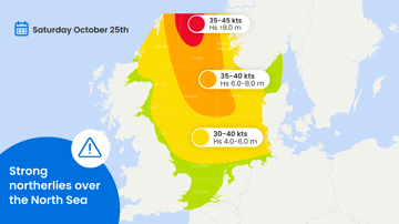 A complex Atlantic low is located in between Greenland and Iceland on Tuesday. An associated frontal trough leaves the North Sea, moving further east over the Baltic Sea. In its wake, a mobile ridge of high pressure crosses the North Sea area on Tuesday from west to east. New low pressure forms west of Ireland in the meantime, arriving over the UK on Tuesday night into Wednesday. An associated frontal trough crosses the North Sea early on Wednesday. The parental low will linger over the Northern North Sea until Friday, moving away to the north at that stage. Strong high pressure over Russia, extends a weak ridge towards the North Sea on Friday. The ridge retreats quickly towards the east again, as a new low-pressure area approaches from the west. The system tracks over the southern parts of the North Sea later on Friday and Saturday. Afterwards, a high-pressure area will move from the Azores to France. This high connects to the high-pressure area over Northern Russia. As a result, strong high pressure develops with the center over Northwest Russia, extending a ridge over the North Sea.You will find a video briefing at the end of this article