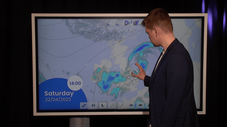 Figure 2: Isobars (black lines 5hPa) and wind speed/direction (kts) valid Sunday April 23rd 12UTC.