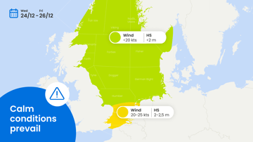 At first calm conditions prevail over the North Sea as a ridge of high pressure stretches towards the area. In the coming days, the ridge will shift north as pressure drops over central Europe and the Alps. The winds will turn to northerly directions and increase to mostly moderate, 3 or 4 Bft, with Hs around 1 meter. Near the English Channel and near the coast of southern Norway, winds will be mostly fresh, 5 Bft. In the southern part of the southern North Sea, this will result in a significant wave height of 2-3 meters.