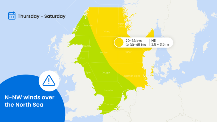 Weather conditions over the North Sea will improve slightly on Wednesday. As the trough continues to extend over Scandinavia and high pressure gradually approaches the North Sea, northerly to northwesterly winds will strengthen along the southern and southwestern Norwegian coast from Thursday and well into Saturday. Wind speeds are generally expected to reach 20–25 knots, with occasional local increases up to 30–33 knots. Wind gusts may rise to 30–35 knots and locally up to 40–45 knots. Significant wave heights are expected to build to 2.5–3.5 meters (see Figure 1).