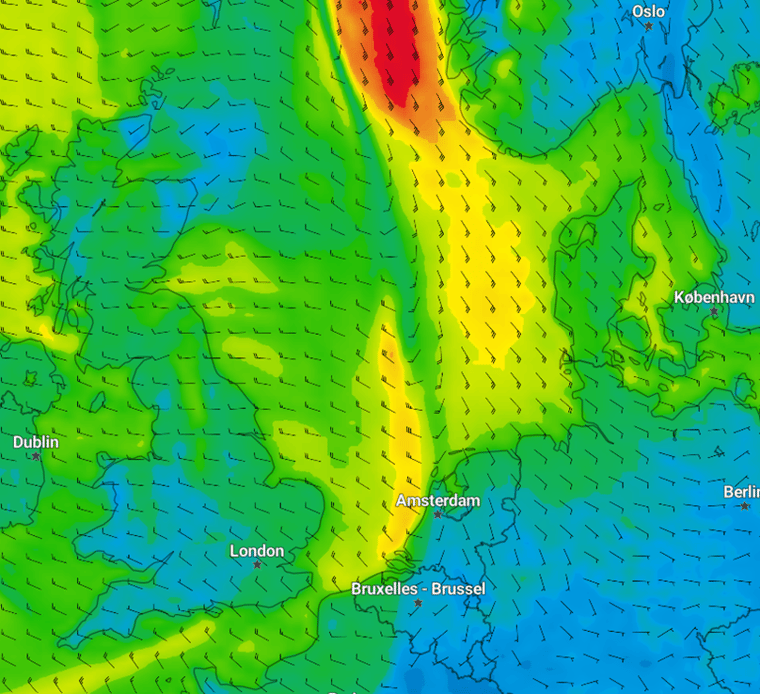 Figure 1: Wind speed and wind direction over the North Sea on Friday the 10th of April at 00UTC