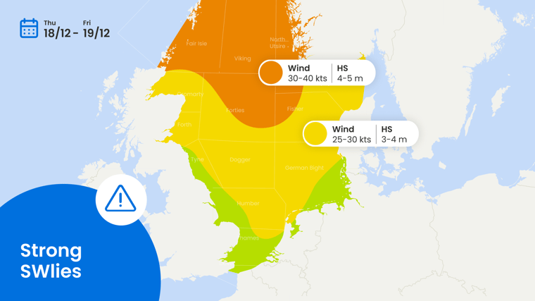 The weather starts somewhat unsettled on the North Sea, but particularly on Thursday and Friday, winds will increase significantly (25–40 kts) and Hs will rise to values of 3–5 m across large parts of the North Sea.