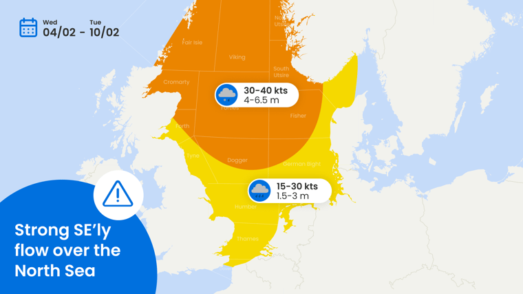 Strong southeasterly flow is expected to persist across the entire North Sea throughout the week. Only the southern parts of the region may experience brief periods of slight improvement.